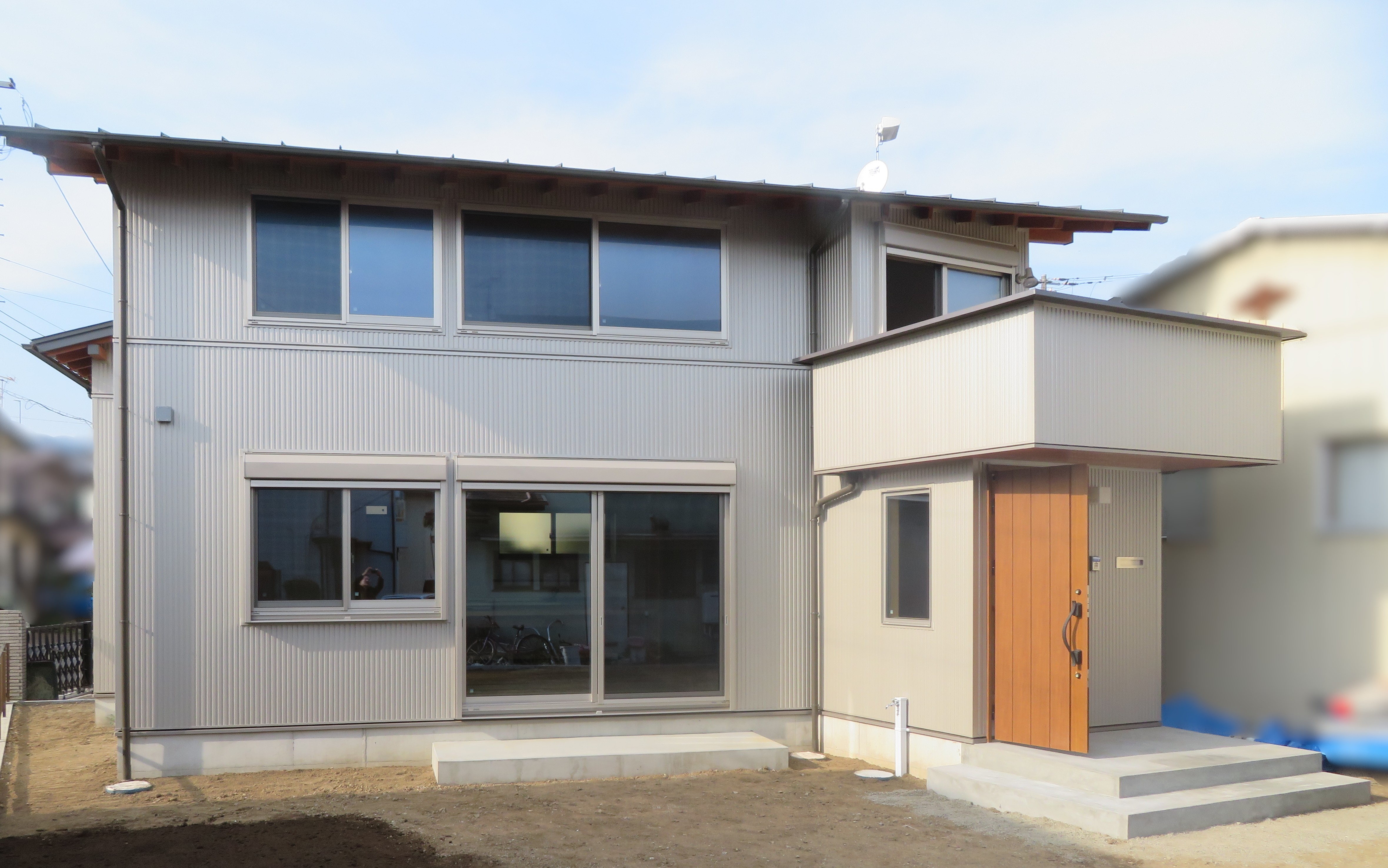 ガルバリュウム鋼板の外壁に杉化粧野地。